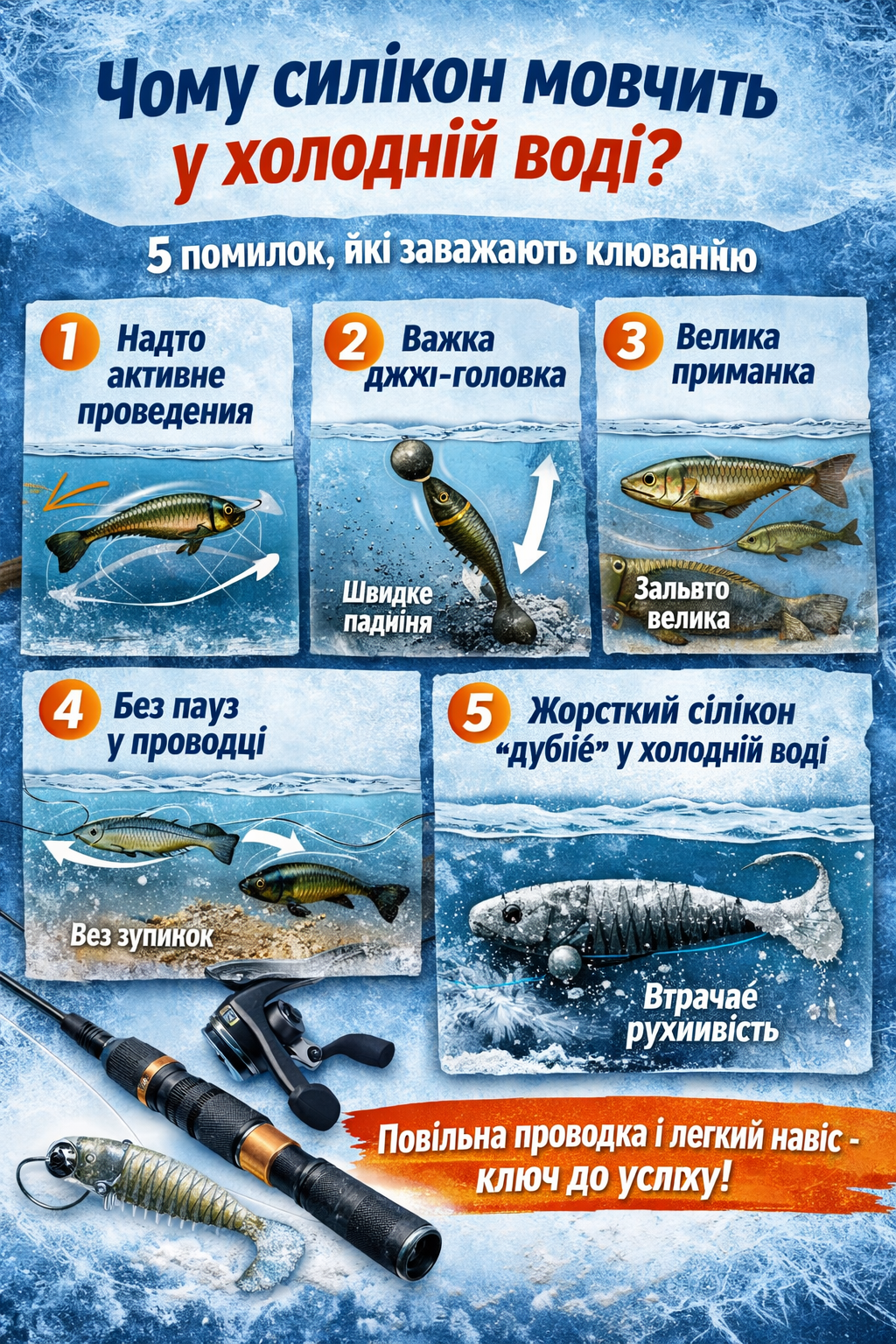 У холодній воді дешеві або жорсткі приманки практично перестають працювати. Хвіст не грає, рух виглядає «мертвим».