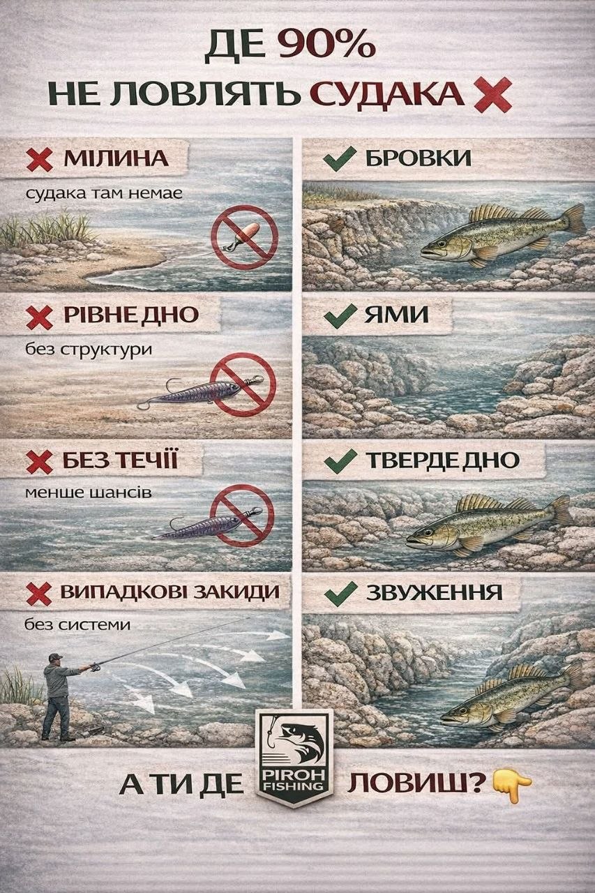 Багато рибалок роками повторюють одну й ту саму помилку: кидають туди, де зручно, а не туди, де реально стоїть судак. Через це потім і народжується знайоме «сьогодні риби немає». Насправді часто проблема не в судаку, а в точці.