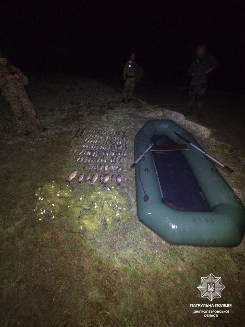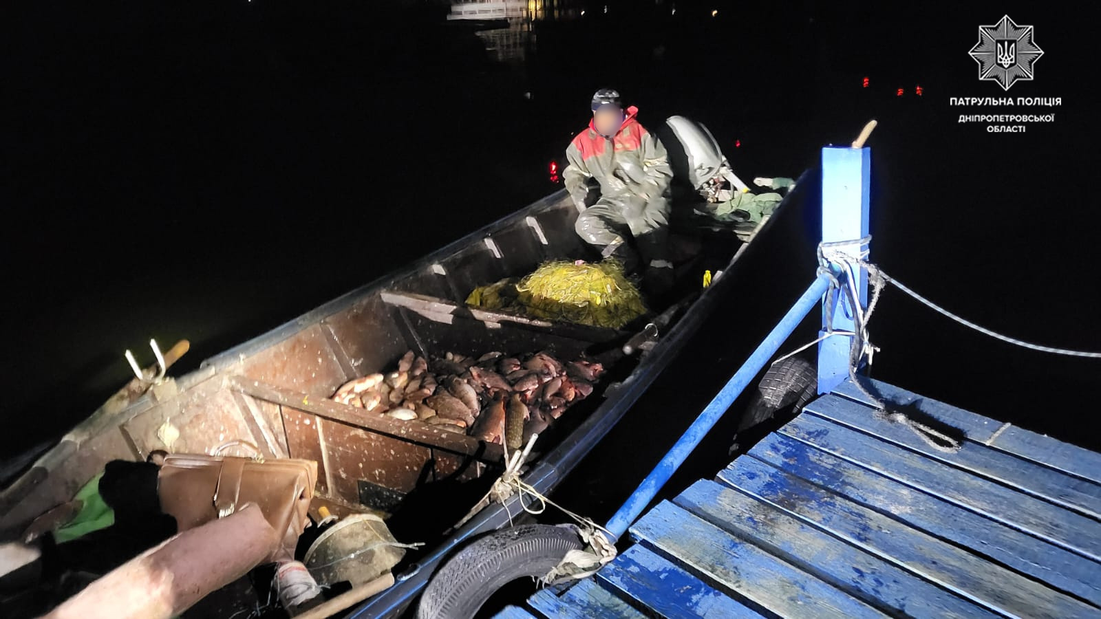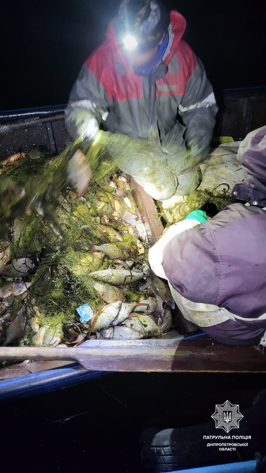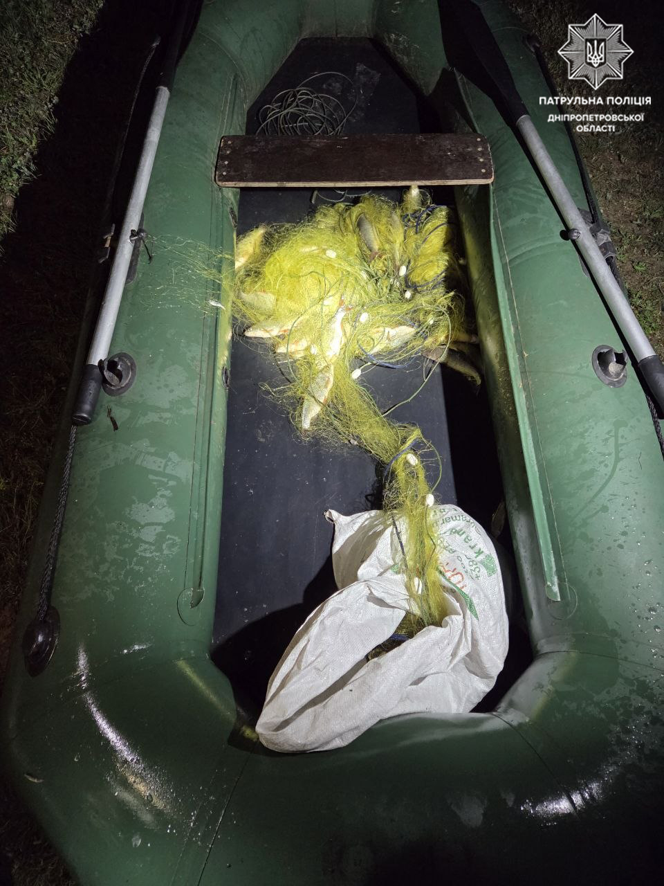 Другий, значно масштабніший випадок зафіксували вже цієї ночі близько 2-ї години на Дніпрі — в акваторії Веслувального каналу. Інспектори помітили човен із двома чоловіками, які витягували з води сітки.