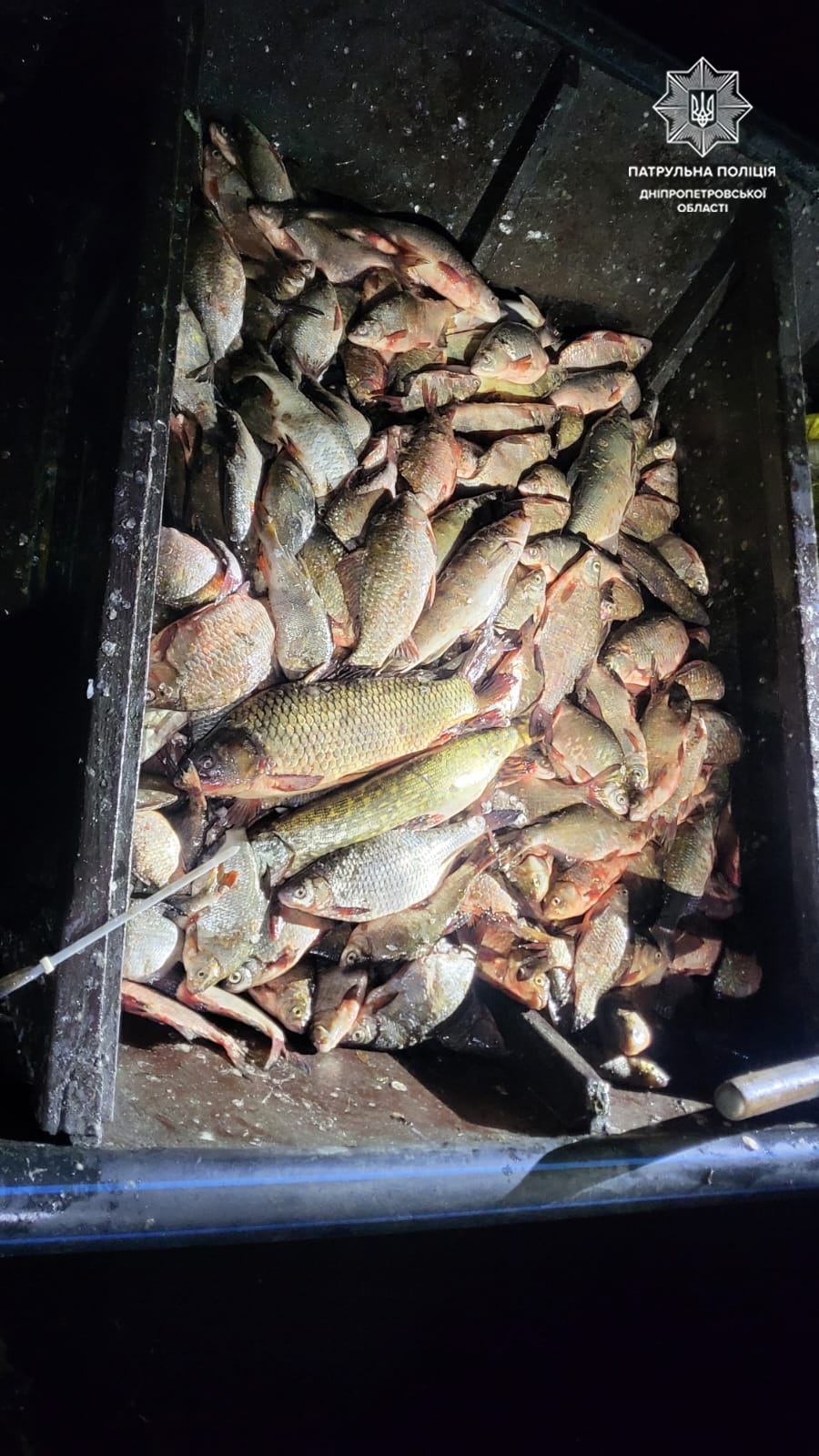 У човні правоохоронці виявили свіжовиловлену рибу та заборонені знаряддя лову. Загалом браконьєри наловили 530 густер, 183 карасі, 37 тараней, 13 судаків, 3 окуні, коропа, щуку та сазана.