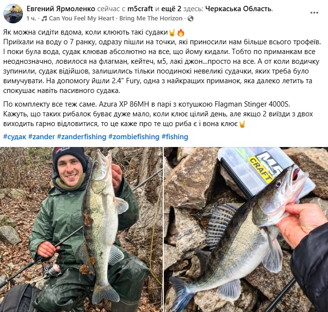 Киянин Євгеній Ярмоленко поділився у Facebook вражаючими результатами риболовлі на Черкащині. За його словами, цього разу виїзд виявився максимально вдалим — судак активно клював із самого ранку.